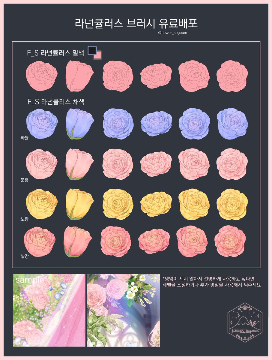 밑색, 채색으로 이루어진 라넌큘러스 브러쉬 유료배포합니다! 클립스튜디오 전용 소재고 포스타입, 픽셀에서 판매하고 있습니다🥰💕 구매는 아래 링크에서!🔽🔽 포타: posty.pe/26z5p6 픽셀: pixel.sc/user/604c9af95…