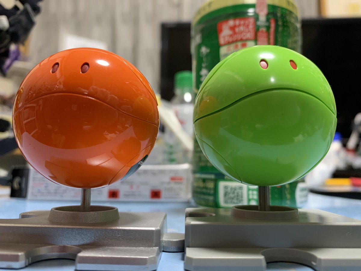 ハロ ベーシックカラー 完成 唐突な完成ツイート昨日買ったハロの口が開くバージョンを成型色を生かして鏡面仕上げにしました。オレンジハロは塗装済みを鏡面仕上げした物です。そんなに違いはないかな? #ガンプラ #ハロ #ガンプラの画像を貼るとRTされると聞いて