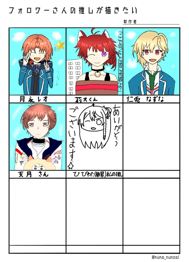 0 7 #フォロワーさんの推しが描きたい 遅くなりましたが…!一応完成致しました〜!リプして下さった方ありがとうございます!(残り4枠残っているのでここのリプ欄で募集します!) 21/03/27 22:13