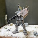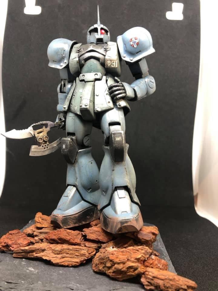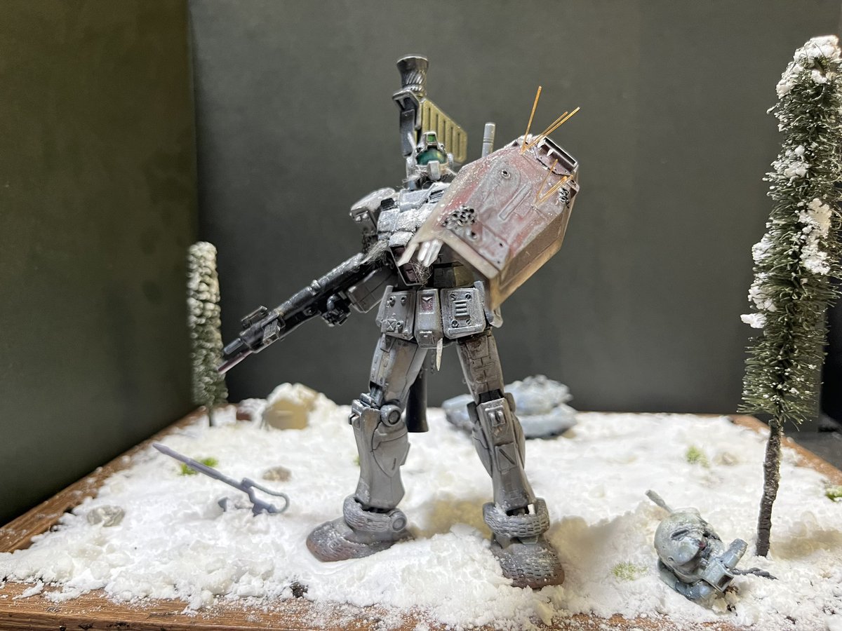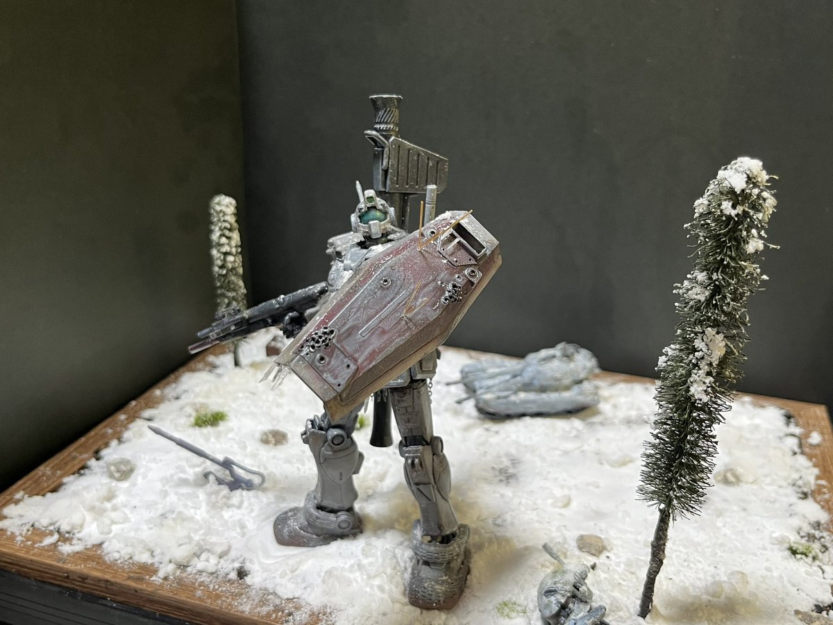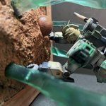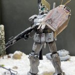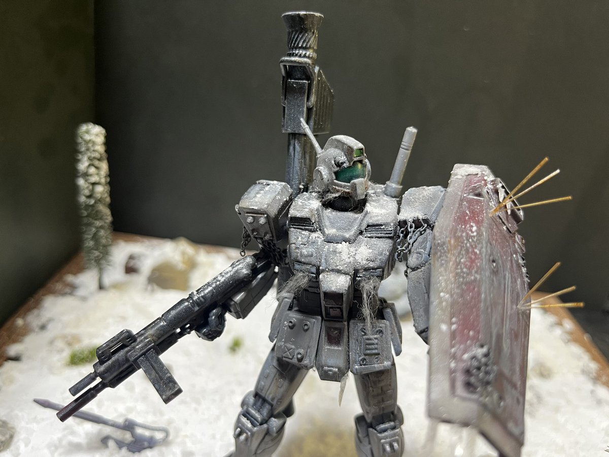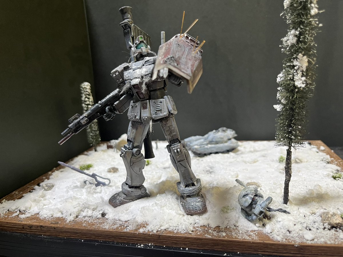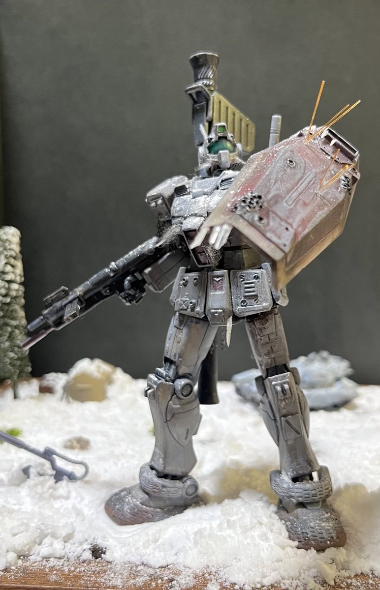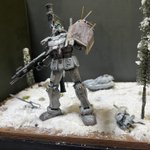 ジオラマジム寒冷地仕様完成しました。 視線の先に森があり、奇襲に気づいた瞬間というイメージで。 ツララやら排気やら凍結イメージのウェザリングでそれっぽく見えたらいいんですが。 #ガンプラ #ガンプラ好きと繋がりたい #ガンプラの画像貼るとRTされると聞いて