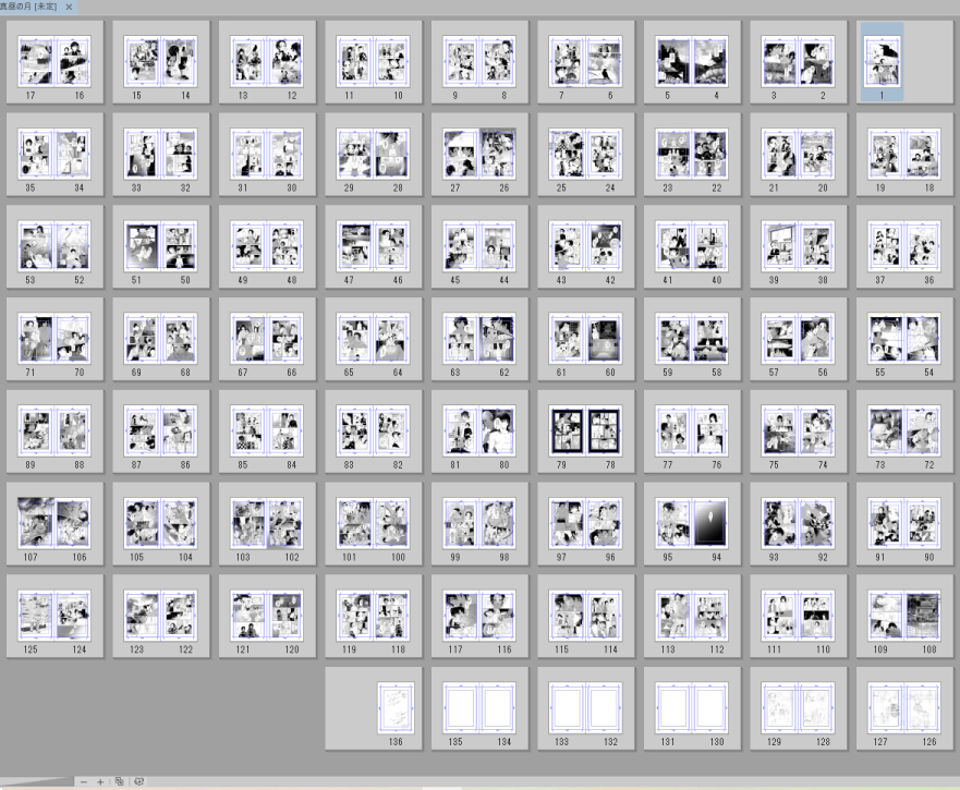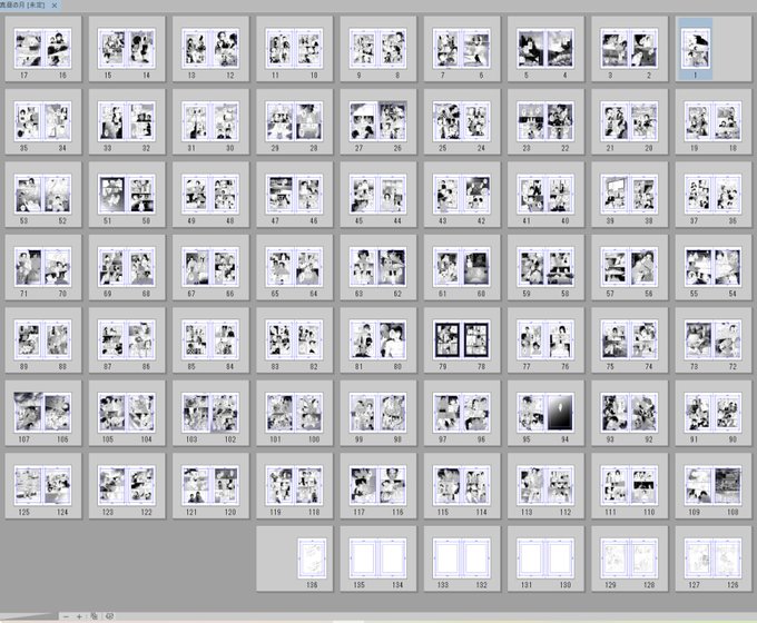2 90 義炭漫画まとめに向かってます クリスタでページ見開き設定にしてるんだけど現在135ページ、こうして見るとそんな多く見えないな… もっと細かく描きたいとこあってでもそれやったら永遠に終わらんので我慢してます。最終的に何ページになるのかわからんですがとにかくまとめようとコンテ切ってます👍 23/01/12 20:50