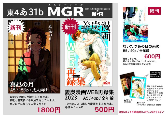 30 111 【6/25JBFES2023】義炭本のおしながきです きめつでオフイベ参加初めてなのでとても嬉しいです。 半面イベント自体4年ぶりで不慣れなところ多いかもしれません。なんとか失礼のないよう努めたいと思います! なお当日は友人がヘルプで入ってくれることになりました。どうぞよろしくお願いします🙇 23/06/20 22:37