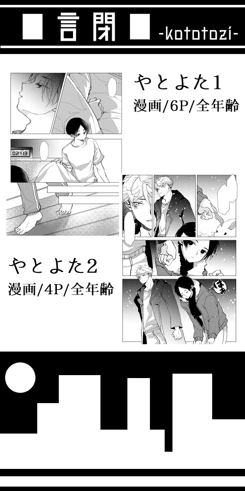 #僕達はまた真っ白なキャンバスに絵を描く 3/26webオンリーのお品書きです サークル名:言閉 スペース:Bえ3 やとよた漫画をポイピクにてパスワード展示します よろしくお願いします🐯🌏