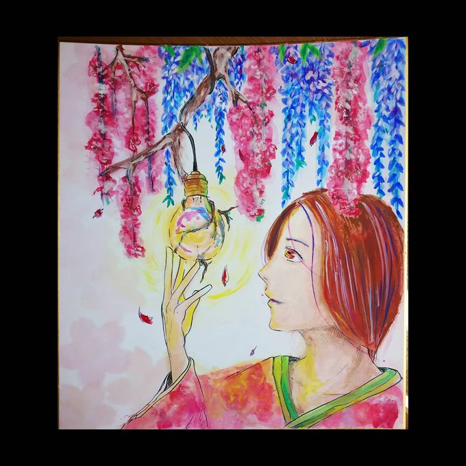 0 6 祖母に送る絵です。 途中色がどうなるかと焦ってたんですけど、 それなりに綺麗にできたので、良かった! #イラスト #illustration #藤 #桜 #藤の花 #電球 #水彩画 #アクリル 21/04/25 17:46