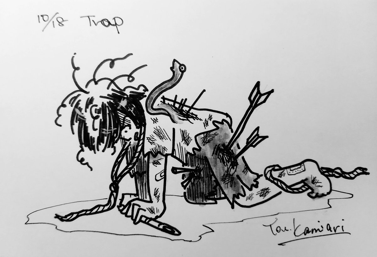 今日は雨なのでおこもりして絵を描く(笑) inktoberの16,17,18日分のイラストを投稿です。 ※16,17日分はミックスで描きました(左側の絵)☆ 18日のイラストは『罠にかかりすぎた男』 #inktober #inktober2020 #inktober2020day16 #inktober2020day17 #inktober2020day18 #illustration