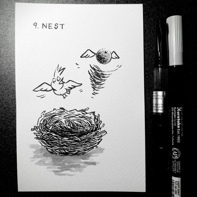 で、本日のお題は『NEST』 意味は『巣』 さて、巣から飛び立ってる右のものは いったい何でしょうか? …単なる洒落です(笑) #inktober2022 #kuretake_inktober2022 #インクトーバー2022 #illustration #イラスト #アナログイラスト #nest #巣