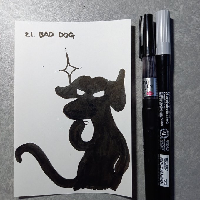 21.BAD DOG これはオリジナルではなくて 思い出して描いたもの。 川原泉さんのマンガに出てきた ダミアン(笑) 悪そうなのにビビりなのがツボってた☆ 現物見ないで描いた為 間違えてたら申し訳ない💧 #inktober2022 #kuretake_inktober2022 #インクトーバー2022 #baddog #悪い犬 #アナログイラスト