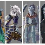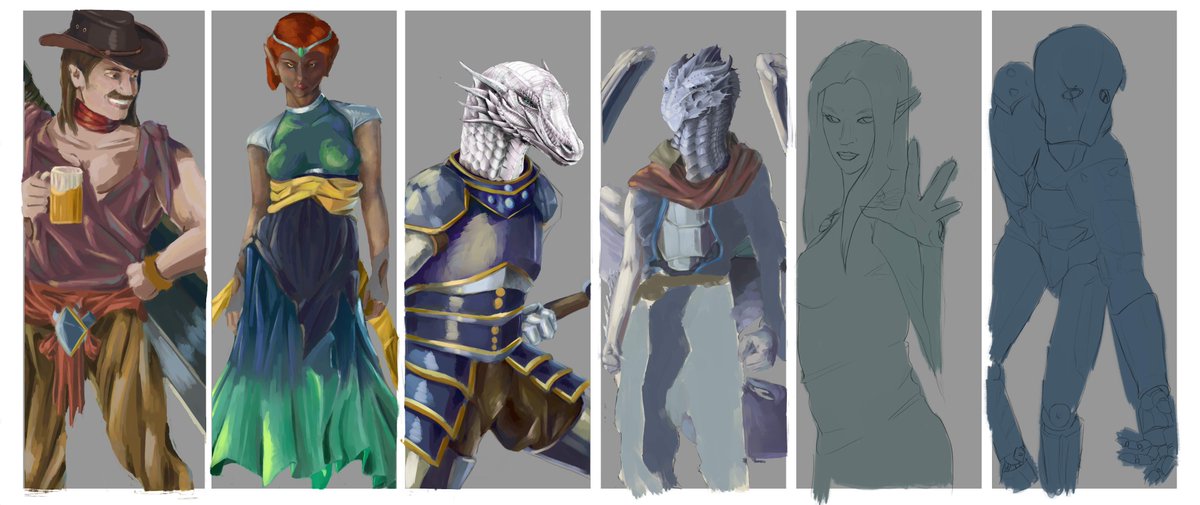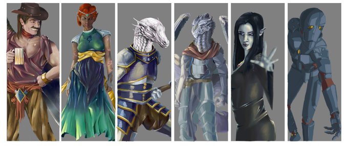 #wipart for the #Mythfits party poster continues. 3/6 panels finished. The two dragonborn and warforged are left. #dndart #commissionsopen #artistforhire #digitalart #painterly #corelpainteressentials #hireme