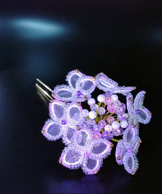 独自手法の裏から見ても美しい立体ビーズ刺繍。ガクアジサイのかんざしを作りました。キラキラビーズが雨の雫をまとった花びらを表現しています。 #立体ビーズ刺繍 #ハンドメイド好きな方と繋がりたい #夏の創作クラスタフォロー祭り