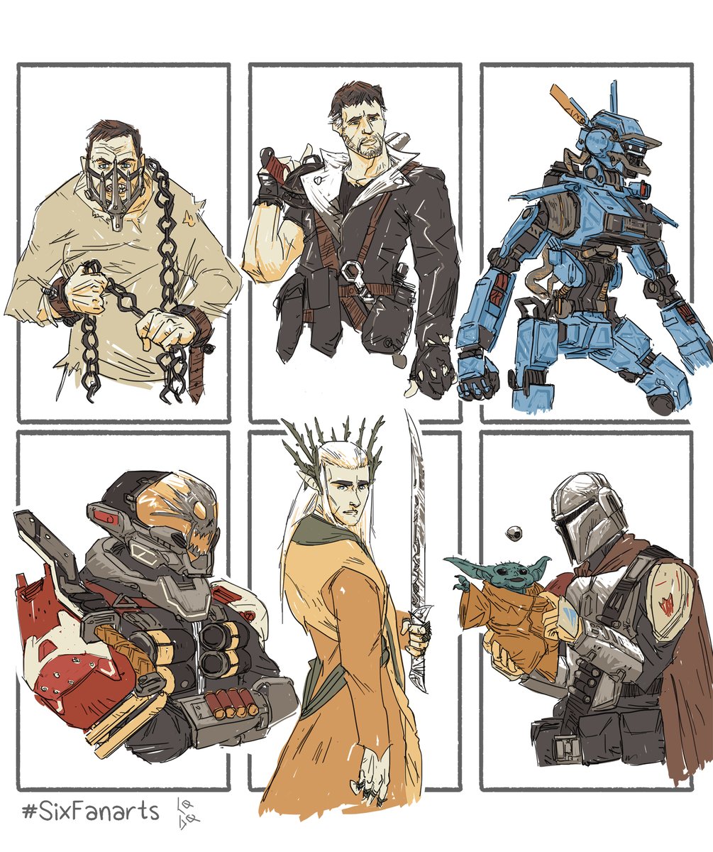 Sketched a new batch of six fan arts! These are fun for practice! #sixfanarts #sixfanartchallenge #characterdesign #illustration #digitalart #madmax #madmaxfuryroad #chappie #halo #haloreach #thranduil #thehobbit #themandalorian #thechild #artistsontwitter