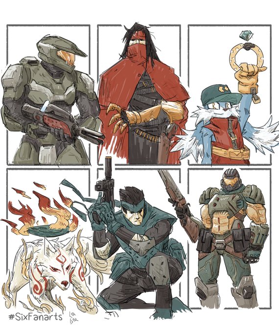 Final group of fanarts for now! Really fun to try my hand at these! #sixfanarts #sixfanartschallenge #characterdesign #illustration #digitalart #artistsontwitter #halo #FinalFantasyVII #vincentvalentine #klonoa #okami #metalgearsolid #solidsnake #doomguy #doomslayer #doometernal