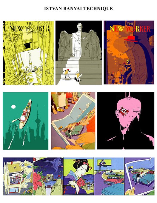 Rest in peace Istvan Banyai. I really love his work. Iconic illustrator from the 90s. He pioneered the flat cel shaded illustration look with actual cels and cel paint before he switched to digital later in his career. nytimes.com/2023/02/18/art…
