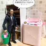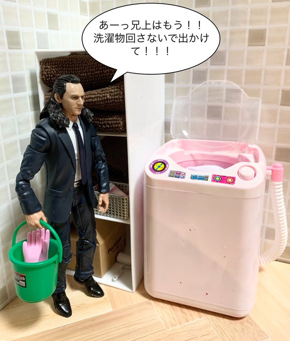 ⚡️🐍ソーロキミッドガルドライフ 洗濯物をちゃんとして欲しいロキちゃん DAISOのおもちゃの洗濯機をリペイント。これ、水を入れると洗濯物ごとくるくるまわります #夜のフィギュア撮影会 #DAISO #ミニチュア洗濯機