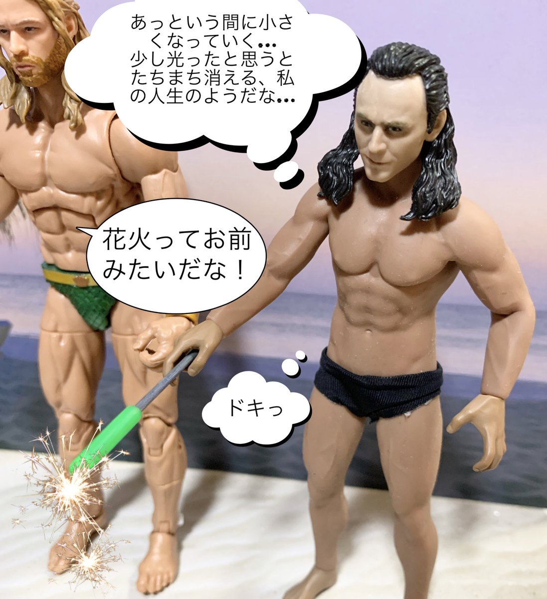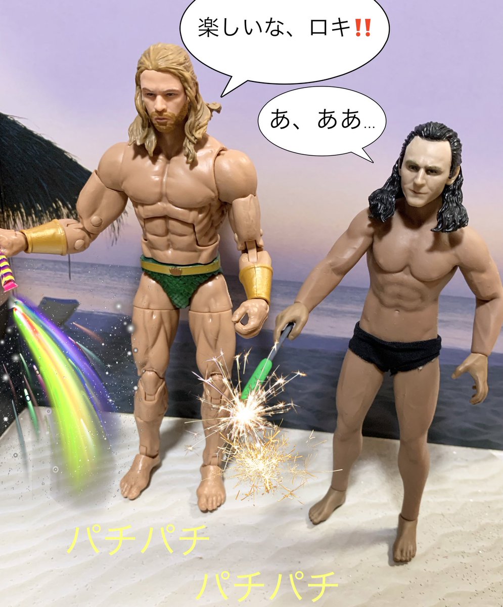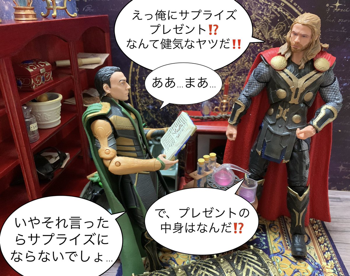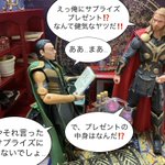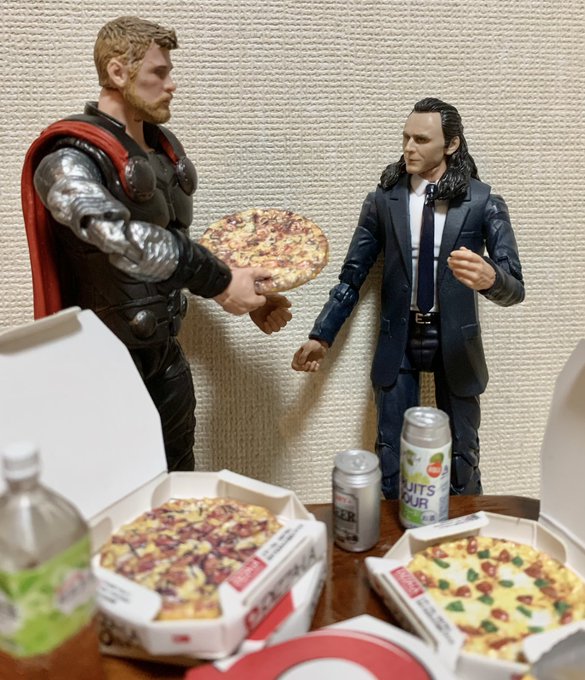ロキちゃん(の中の人)のお誕生会にて〜 🐍皆の者ありがとう! …つかぬことを訊くが、これをセッティングしたのは兄上か? ⚡️そうだ!! 🐍…なんでピザしかないんだ? ⚡️俺が好きだからだ!!ポテチもあるぞ!! 🐍あー、うん… 思いっきり兄上の好みのお誕生会😅 #夜のフィギュア撮影会