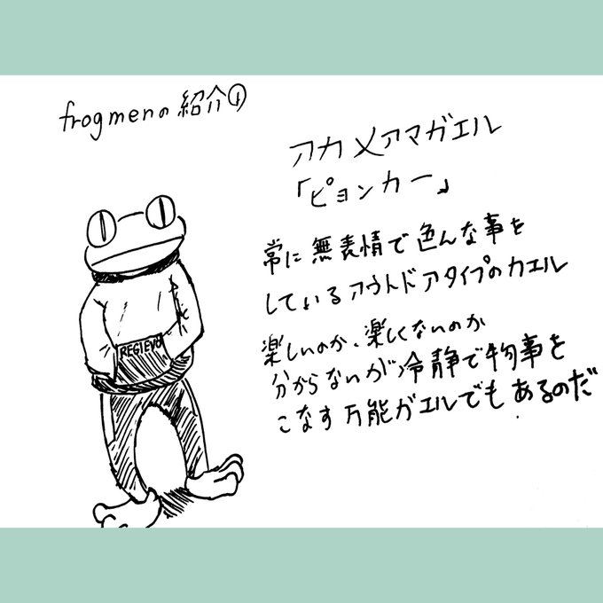 1 3 frogmenの自己紹介1 アカメアマガエル 「ピョンカー」 #frogmen #frog #カエル #アート #イラスト #オリジナルキャラクター #ファッション #洋服 #REGIEVO 22/03/05 15:48