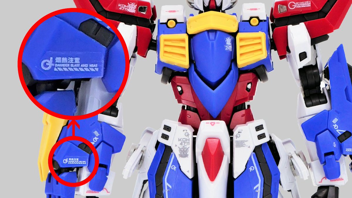 RGゴッドガンダムようやく完成。 リアリティックデカール全貼りしてみました! ゴッドフィンガ―プロテクターのデカール、よーく見ると「爆熱注意」って書いてある!!こまけーー😆 #ガンプラ #ガンプラ好きな人と繋がりたい #RGゴッドガンダム