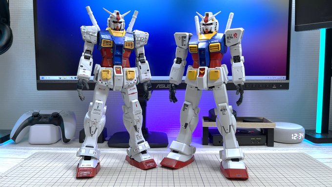 day 9(PGガンダム制作状況報告) 2つのPG RX-78-2 ガンダム完成しましたー😝 旧キットの胴部と腰部の接続軸がキツキツで全然ハマらなかったけど、これってウチだけ?? あとは動画撮影と編集・・・まだまだ苦行は続く。 #ガンプラ #ガンプラ好きと繋がりたい