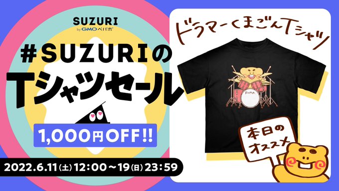 【#SUZURIのTシャツセール】 本日のオススメ ドラマーくまごんTシャツ🥁 ▼対象アイテムと値引き額 半袖Tシャツ9種が1点につき1,000円引き ▼期間 2022.6/11(土)12:00〜6/19(日)23:59 ▼セール会場 suzuri.jp/frrk_gyouza/om… #suzuri #suzuriで販売中 #イラスト