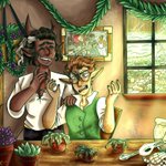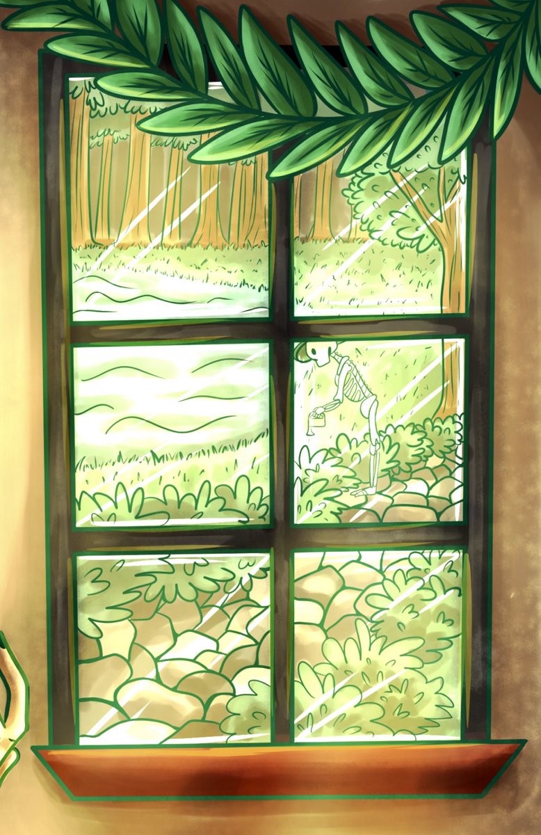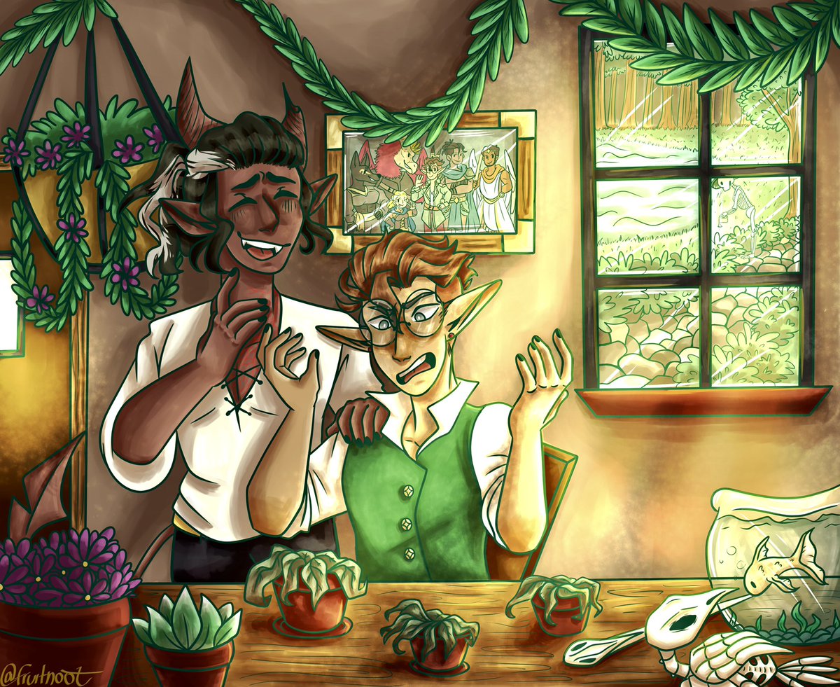 Here’s a illustration I did of my dnd character and his bf, some of my favorite details in the background are the portrait of the party and the skeleton gardener #dungeonsanddragons #dndart #DnDcharacter #dnd #artistsontwitter #arttwt