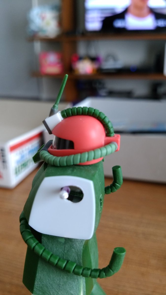 水中用ザク進捗状況。モノアイカバーをスイーツの蓋を切り取って形を決め、ちょんまげパイプは頭頂部に密着するように。これで頭は決まりかな。 #ガンプラ #旧キット #MSV