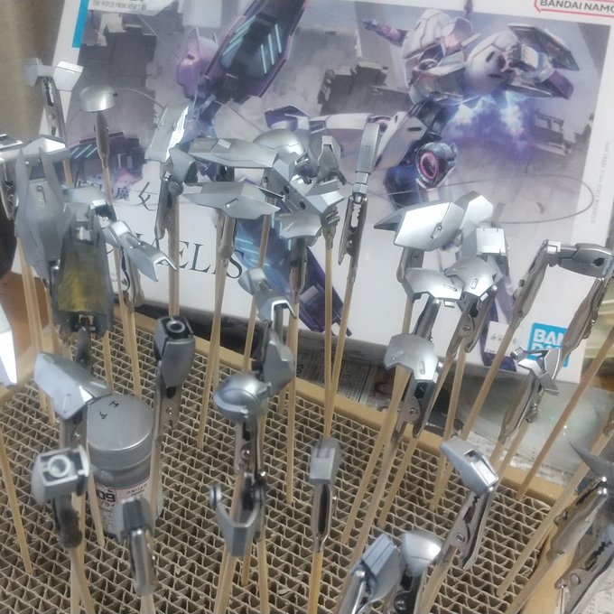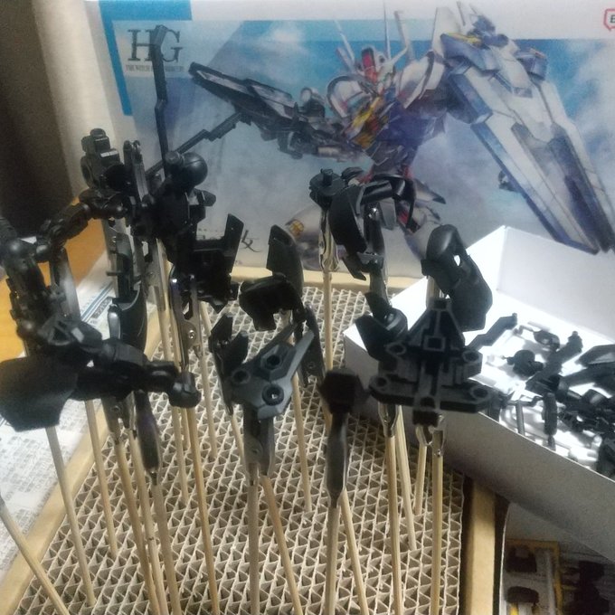 まだ初めて24時間経ってないが、すでに大部分のパーツは黒だ🤯 足にジャンクパーツを付けて穴埋め、脚の合わせ目は消さずに削ってモールドとした✌️ #ガンプラの画像貼るとRTされると聞いて #エアリアル #ガンプラ好きと繋がりたい