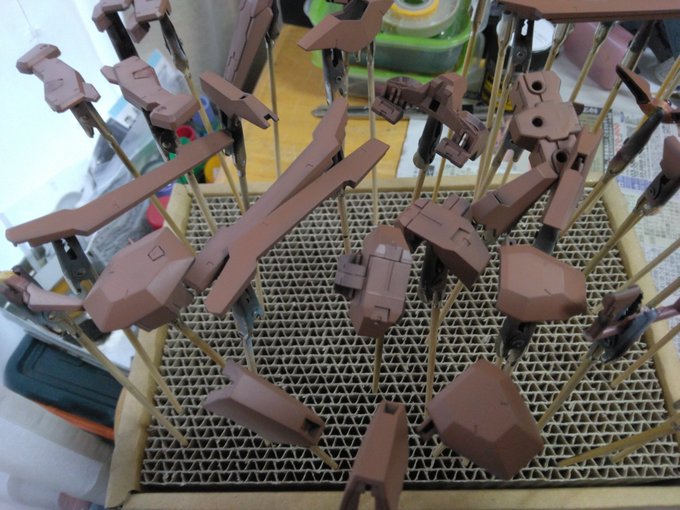最近、手持ちの塗料が把握できてない🙄あるはずのマホガニーが無く、ウッドブラウンが2本ある 仕方が無いので、下塗りは艦底色とした👍 #ガンダムルブリスウル #ガンプラの画像貼るとRTされると聞いて #ガンプラ好きと繋がりたい