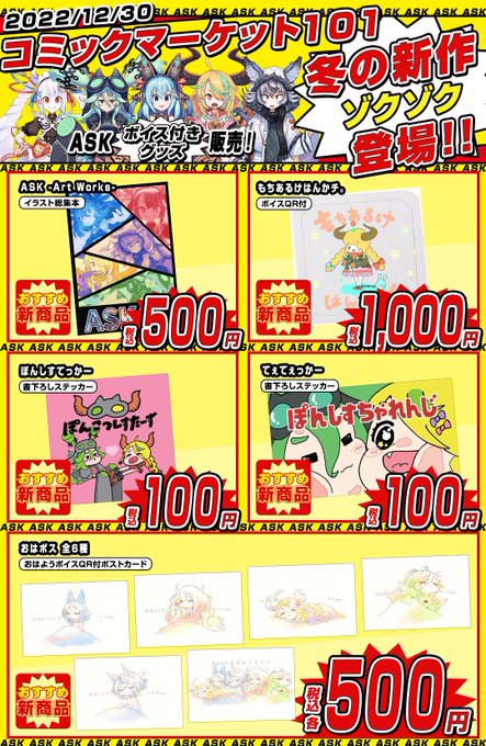 もうすぐ冬コミ1日目、開場ですねっ👏 東 J 04b ! 東 J 04b ! 東 J 04b ! 冬の新作とともにお待ちしてます☺️ 【新作含めたご購入の一会計】に1枚、ASKメンバーのお名刺がランダムでついてきますが、数量限定なのでご配慮くださいねっ🎉 さあ、お祭りだっっ✨✨✨ #C101 #コミックマーケット twitter.com/ask11911/statu…