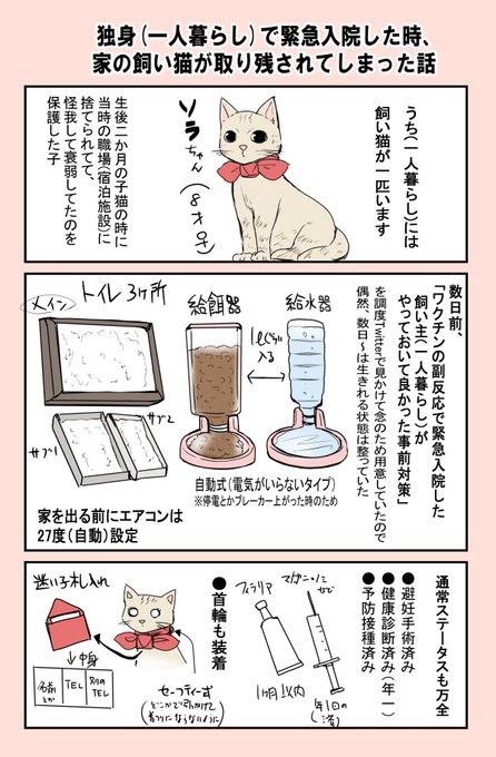 【闘病雑記①】 飼い主が一人暮らしで緊急入院した時、 ペットの猫が家に取り残されてしまった話 >偶然、ワクチンの副作用で飼い主が緊急入院したツイートを見かけて念のために準備していて良かったです。 あと知人とご家族とそこのお家の猫ちゃんも仲良くして下さってとても感謝😭🙏✨ twitter.com/fubukikaede02/…