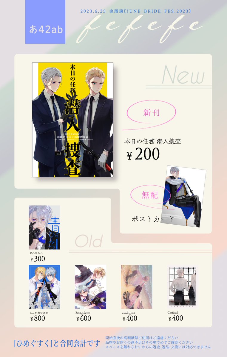 6/25 金瑠璃【JUNE BRIDE FES .2023】 東1ア13ab「ひめぐすくfefefe」 新刊「本日の任務 潜入捜査」A5/16P/200円 政府所属のくにちょぎがバディで潜入捜査!のラブコメです 【Pixiv】pixiv.net/artworks/10929… 【通販】虎の穴:申請中