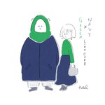 グリーン×ネイビーのリンクコーデ。 ビビットな緑が寒空に映えます。 #イラスト好きな人と繋がりたい #イラストレーターさんと繋がりたい #イラスト #Illustrator #illust #イラストレーター #線画イラスト #線画 #イラストレーション #リンクコーデ