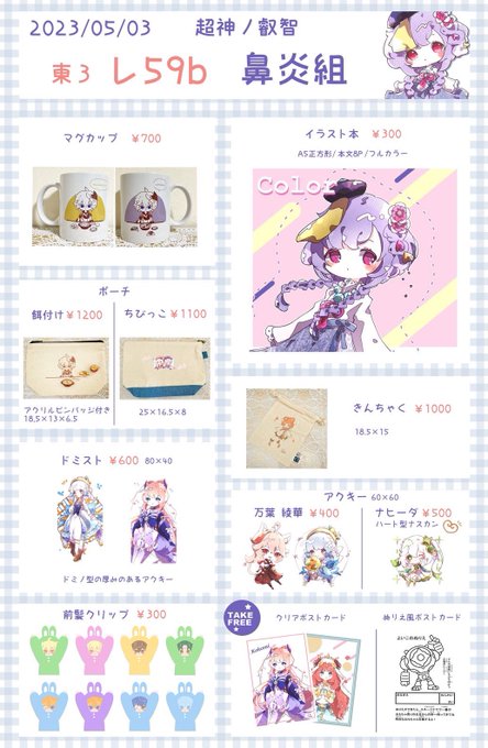 ✨🌷🌷お知らせ🌷✨✨ 5/3 超神の叡智 【東3 レ 59b】鼻炎組 ※姉、母、私の3人で参加です 超神ノ叡智2023のおしながきです。 ・高額紙幣はお釣りが用意できない可能性があります。 ・金銭の受け渡しはトレーにて対応させていただきます。… twitter.com/i/web/status/1…