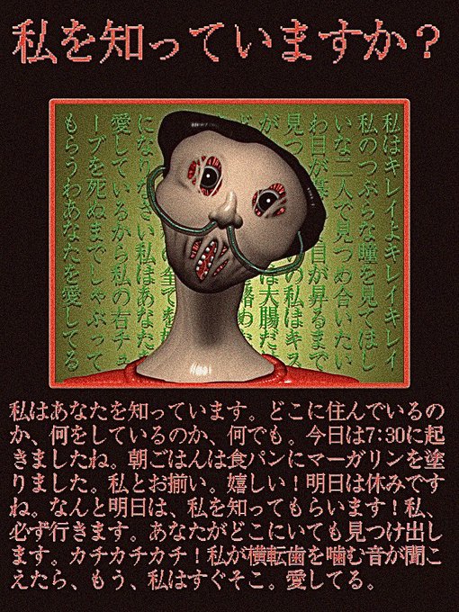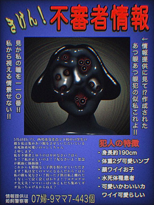 179 1344 不審者情報です。彼女のシーズンがやってきました。屍蝋化してフレキシブルになった顔面に子供子供子供を収納する悪癖女です。名をマンミ。190㎝の柔らかい図体が時速50㎞で突然猛突進、あなたは2ダンプ分の質量に絡め取られます。子供たちの嗄れた絶叫が近くで聞こえたらすぐに乾燥した所へ。 23/05/11 21:10