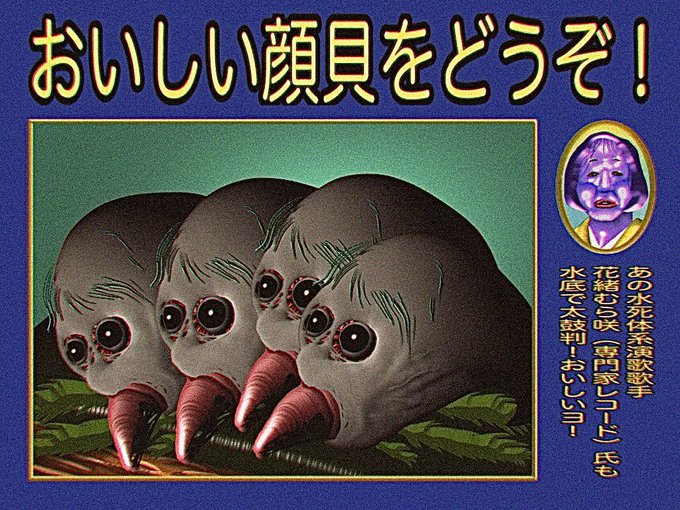 80 541 顔貝は、赤貝と低脂肪牛乳を足して2で割ったような味がします。 生食については、噛むと粘っこい真っ赤な泥が出て気味が悪いので加熱調理をお勧めします。 また、茹でると子供の絶叫のような音が出るので、産地である姫飼町では「ダダコネ」と呼びます。 22/12/11 18:29