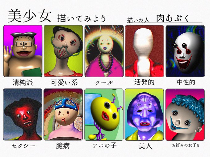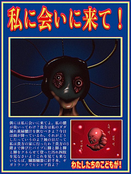 不審者情報です。彼女のシーズンがやってきました。屍蝋化してフレキシブルになった顔面に子供子供子供を収納する悪癖女です。名をマンミ。190㎝の柔らかい図体が時速50㎞で突然猛突進、あなたは2ダンプ分の質量に絡め取られます。子供たちの嗄れた絶叫が近くで聞こえたらすぐに乾燥した所へ。