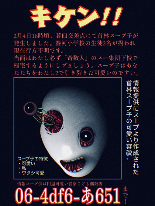 キケン!!不審者情報。首林スープ子が発生スープ。スープスープスープわたし可愛いスープ。わたし可愛いしてしまいました。