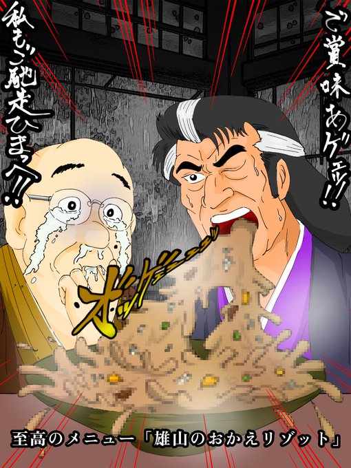 至高のメニュー 『雄山のおかえリゾット』 シメに出される逸品。ご飯を半分咀嚼して飲み込み、これまで食べた料理が溜まった胃袋内部の貴きドロドロと混ぜ合わせる。(雄山はここで激しい日本舞踊を踊り、胃袋を混ぜ混ぜした) 喉に清潔な指を入れて器に吐き出したら完成。