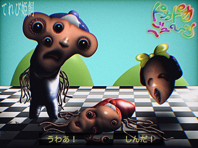 『ト゚カト゚カニ゙ュ〜ン』 1993~2002年まで、てれび姫飼で放送されていた教育番組。ト゚カト゚カタウンの少年少女たち(左からブル坊・ベニ納言・やよいさん)による道徳的な戯れ。脚本は、宗教法人念素の輪教育部。演者は、姫飼町婦人会がボランチアで参加している。