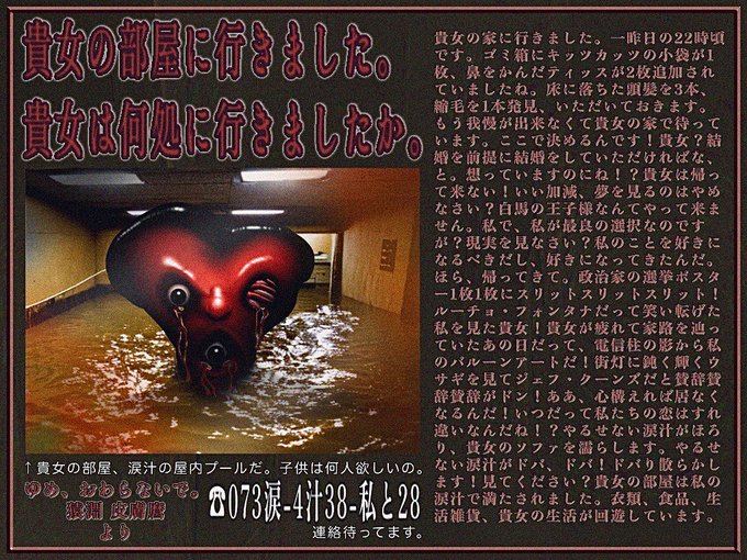 溺、溺、溺!イモムチ彼女がやってくるぞ!?今日の26時にやってくるぞ!? 蛍光色で粘っこく、涙を誘うほどの悪臭を放つ鼻糞混じりのヌルドバ鼻汁風呂で溺愛、溺殺、溺死! この紙を見たあなたは本当に可哀想。 彼女の気が変わって来ないことを祈ることしかできない。浮気なんてしなけりゃあなぁ。