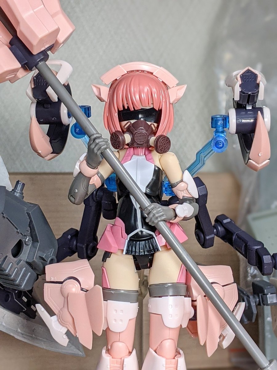 【メガミデバイス 相河愛花 -仁愛-】 仮組み中 重装備に似合うと思って ガスマスクと目隠ししたけど、 なかなかの怪しい雰囲気 #メガミデバイス