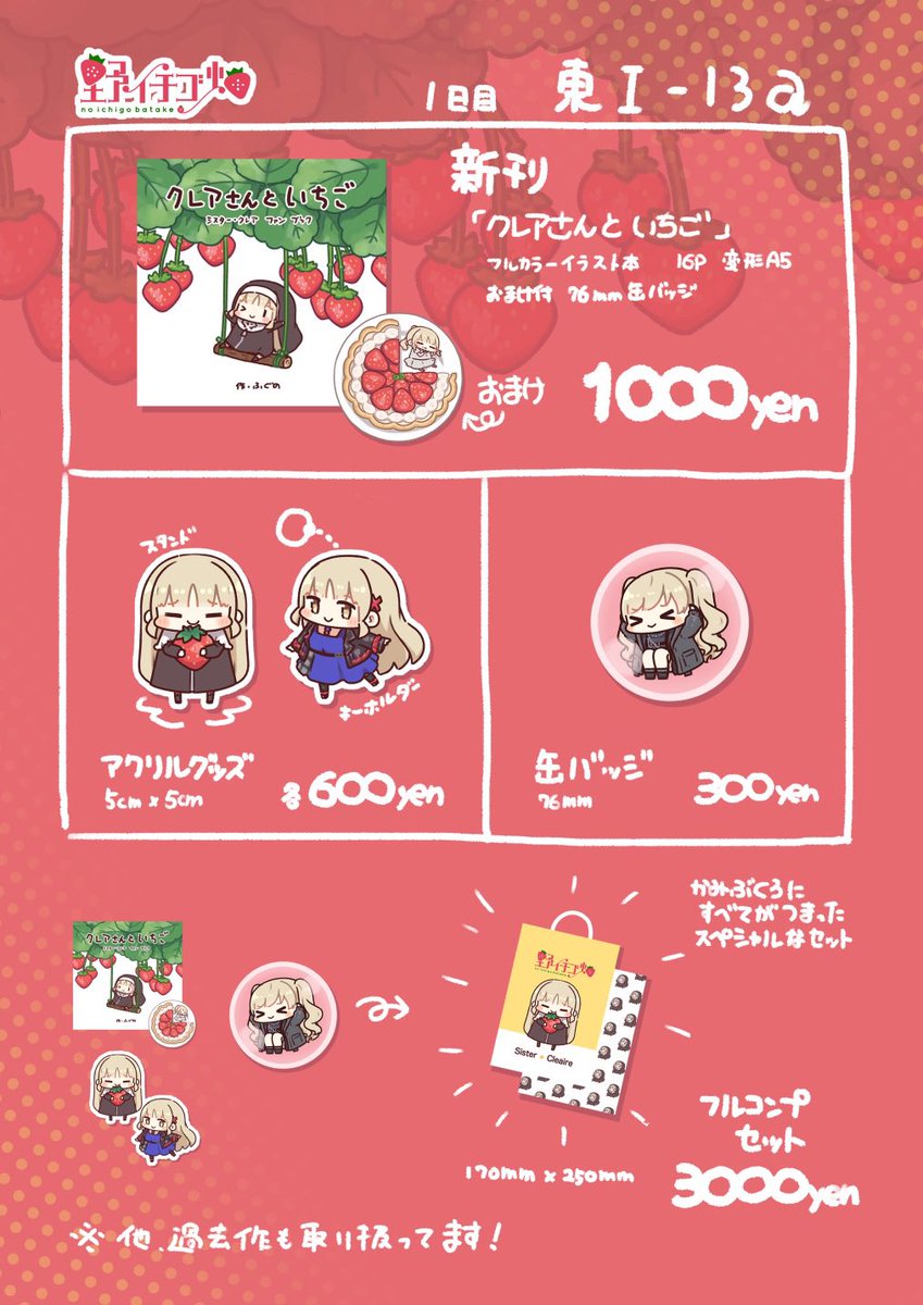 今回のお品書きになります🍓✨ フルコンプセットは紙袋がほしいなという方におすすめのセットです(`・ω・´) 昨年発行のイラスト本やアクリルキーホルダーもありますのでよろしくお願いします…! #C102お品書き
