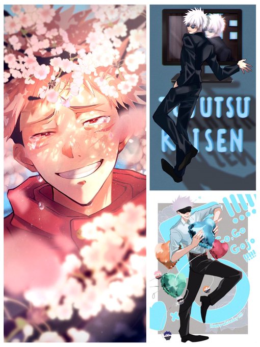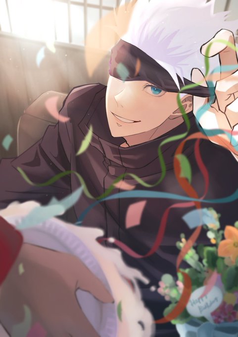 🐯「センセー!!誕生日おめでとーっ!」 🌹「オラァッ!いいもん持ってきてやったからありがたく頂戴しなさいよ!」 🐺「オメデトーゴザイマス」(無表情でクラッカーパァン) #五条悟誕生祭2022 #呪術廻戦ファンアート