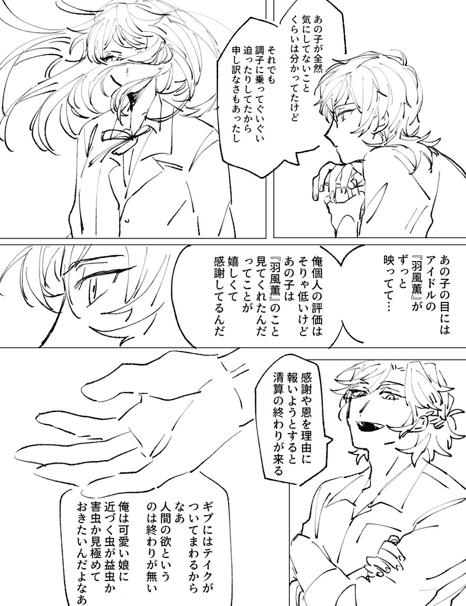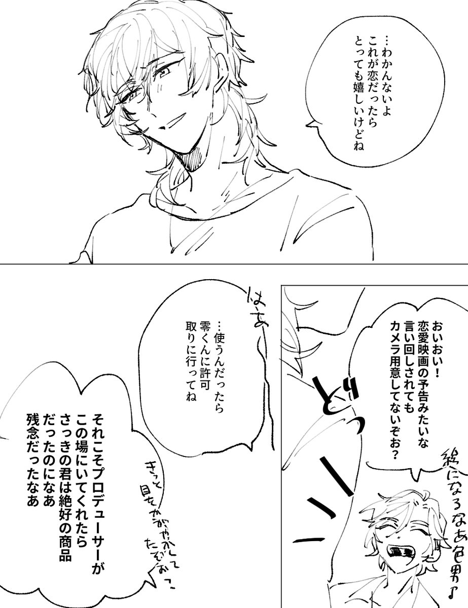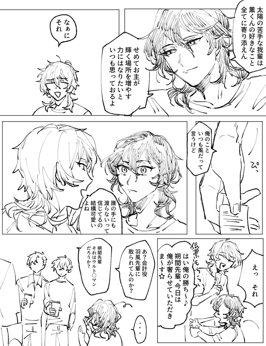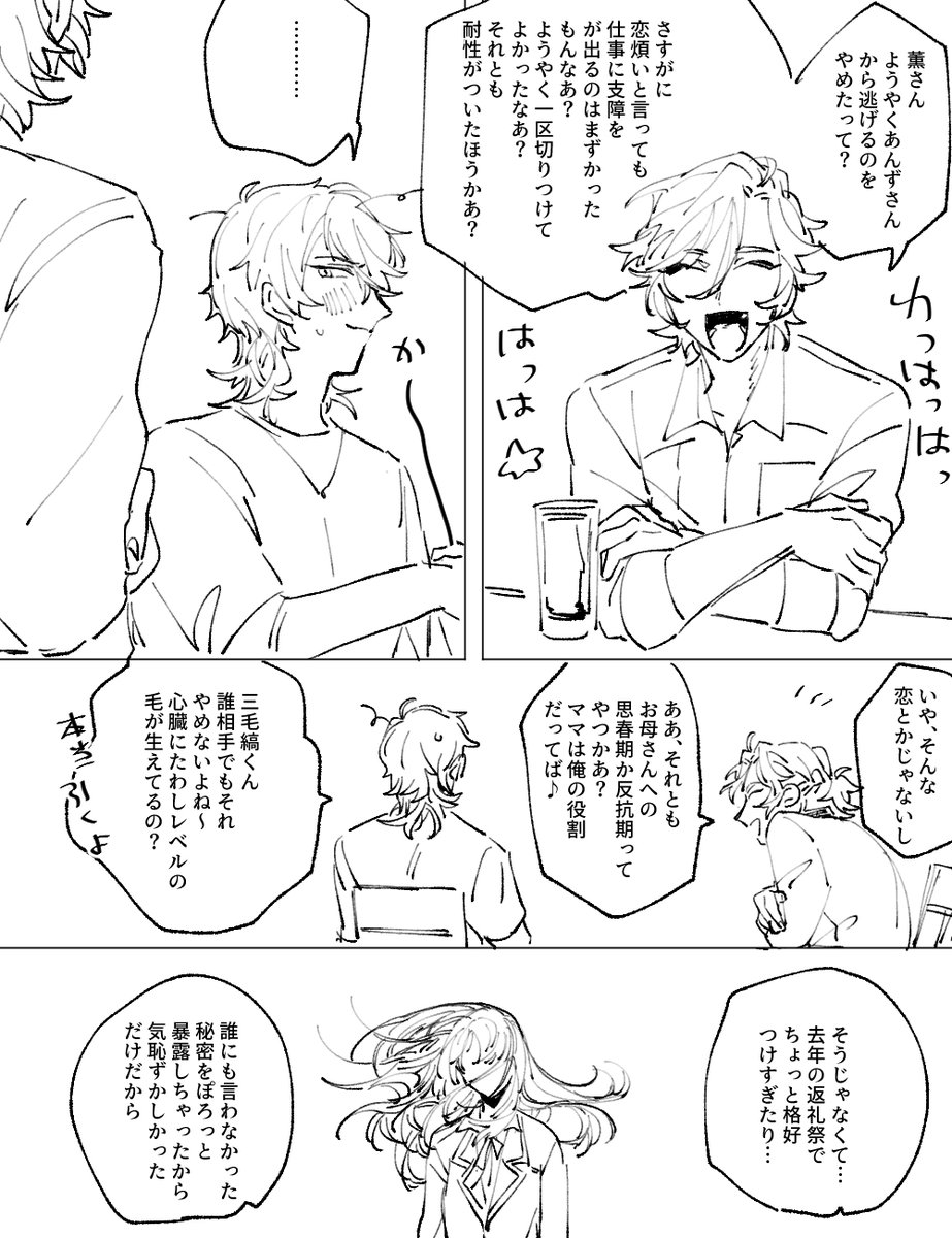 #odaibako_fuji4ta10 odaibako.net/detail/request… お題ありがとうございました!三毛縞が羽風→Pを恋と断定するかどうかについては羽風の自覚が確定してないのでまだ特に何もないんじゃないかなぁと思いますが…三毛縞は本人の意志だろう、と口出しはし無さそうかな~と思います。お節介は焼きそう。