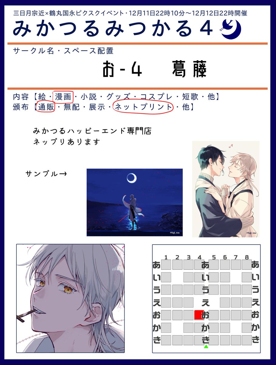 三日月極と鶴丸の㊙ネットプリントです。 絵柄はイベント終了後にツイッターで公開します。 ファミマ・ローソン L判:30円 番号『PEAN75YCDH』期限:24日22時頃・25日17時頃(2枚目) セブン L判:40円 1枚目『HH9YG9HP』期限:23日中 2枚目『7LY3GTLB』期限:24日中 #みかつるみつかる5