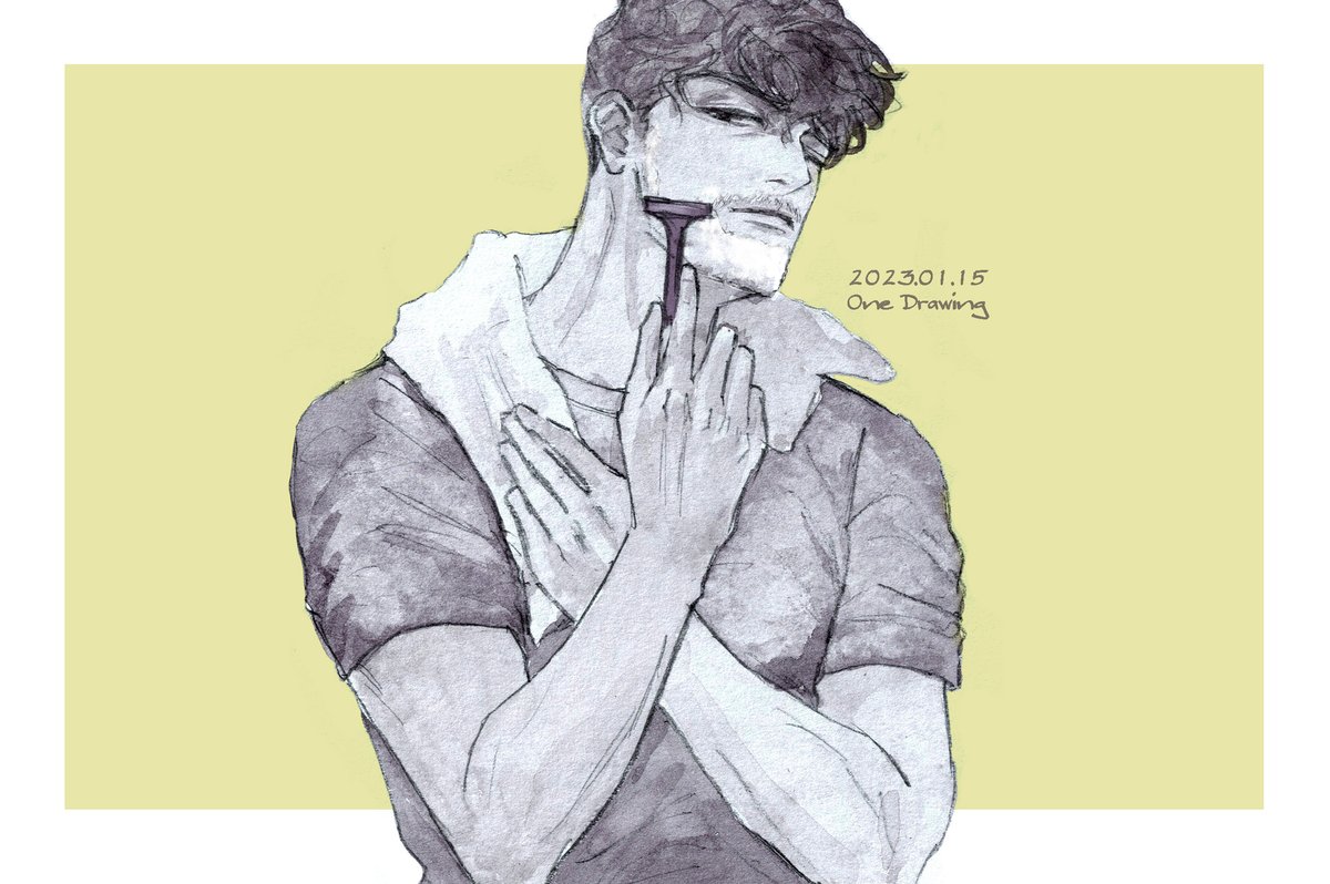 #ヒゲ版深夜の真剣お絵描き60分一本勝負 お題【デートの支度/dressing up for a date】【緊張/anxious】 フライング失礼します!剃刀でしっかり綺麗に仕上げる。横長でどう見えるかな~