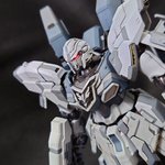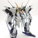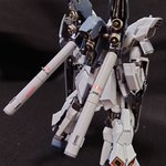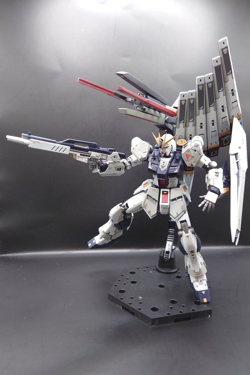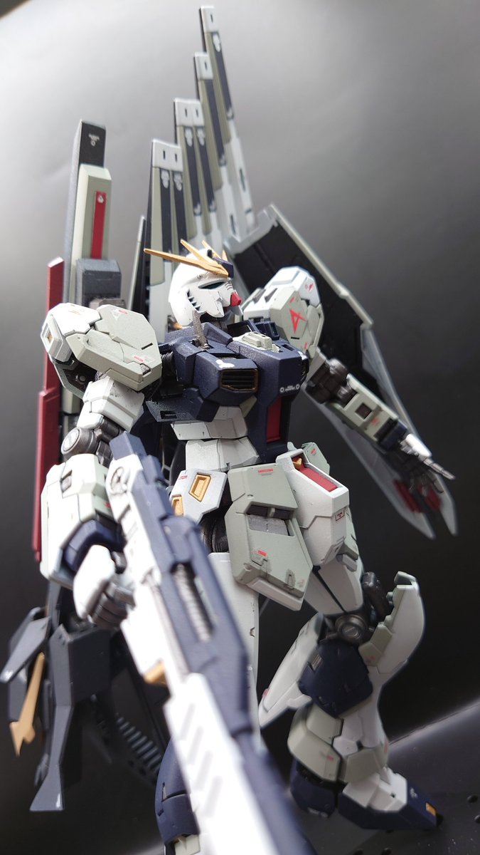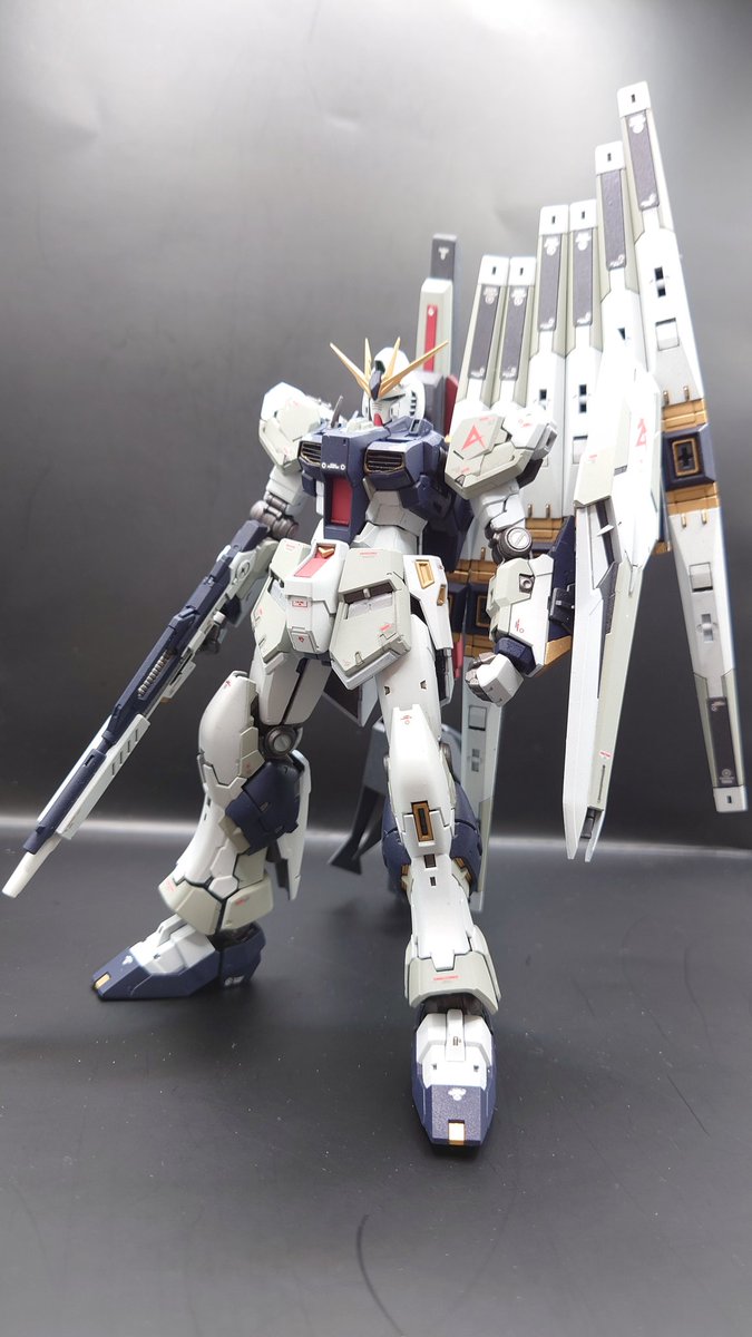 初のRG νガンダム体型改修フルスクラッチロングレンジフィンファンネル添え。完成です💪 元の体型気に入らなくて頭EGに変更して胴体大きくして脚を短足にしました🤗#ガンプラの画像貼るとRTされると聞いて #ガンプラ好きと繋がりたい