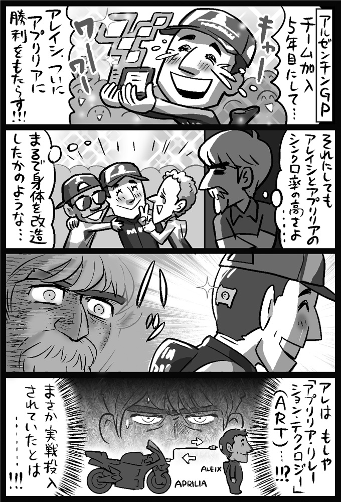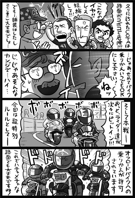 【定期宣伝】ライディングスポーツというバイク雑誌でふざけた二輪レース4コマを描いています。単行本はamazon等にあります。何とぞよろしくお願い致します!!