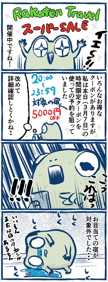 「惨敗です」 初めて楽天トラベルで予約しようと思ってるのですがキャンペーン多すぎていまいちよくわかってないです💦エントリーし忘れてそう😅 #楽天トラベルスーパーSALE #漫画が読めるハッシュタグ #4コマ漫画 #コミックエッセイ
