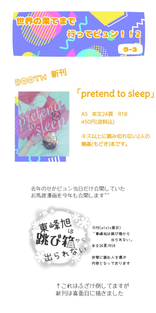 5 8 新刊だけじゃお品書きが寂しかったので、去年のせかビュン当日だけpixivで公開していた跳び箱を今年も公開します^^ 新刊は真面目に描きました。ギャグ無いです。 22/10/29 15:40