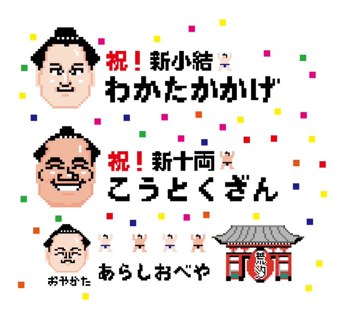 23 187 ㊗️ 若隆景関の新小結昇進と 荒篤山関の新十両昇進の ダブルでめでたい荒汐部屋の ますますのご活躍を期待して! ファミコン風ドット絵でお祝い! おめでとうございます! #荒汐部屋 #若隆景 #荒篤山 #ドット絵 #似顔絵 21/06/22 03:30