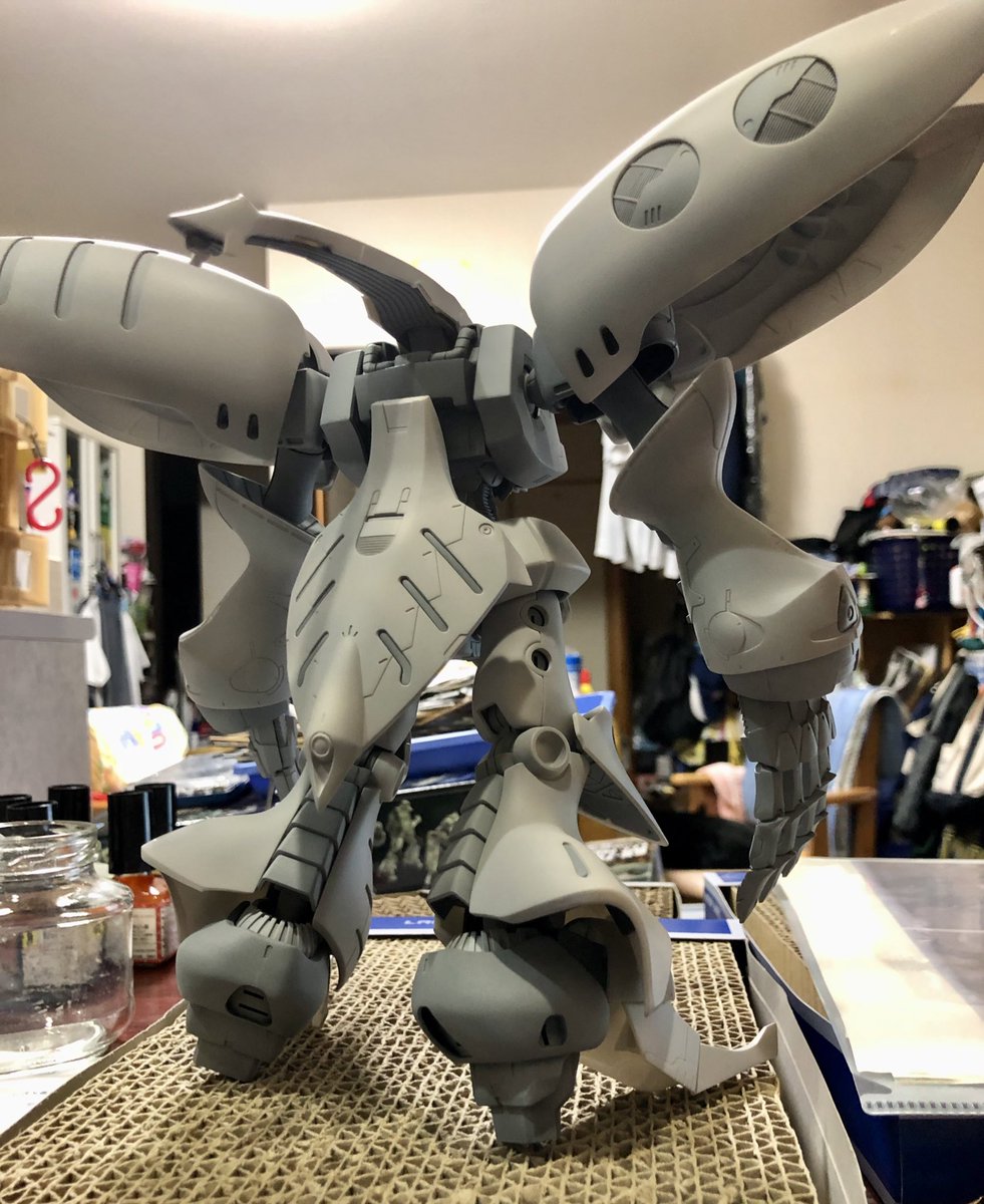 キュベレイダムド、やっと表面処理が終わり、捨てサフ吹きました。 ヒケと歪みがガッツリで結構手間のかかるなキットです😅 #ガンプラ